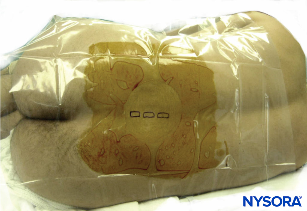 - Mark the midline. This is done by simply aligning the transversely oriented probe such that there is symmetry of the ultrasound appearance (left side of screen being a mirror of the right side). This will correspond to either the transverse spinous process or transverse interlaminar view. Sliding the transversely applied probe in a cephalad direction, a marking pen is used at intervals to mark the skin adjacent to the middle of the long edge of the probe.Practically, it helps to start low and mark above the probe on skin free of ultrasound gel. This technique assumes there is actual symmetry in the patient’s anatomy (no scoliosis, rotation, or metalwork).