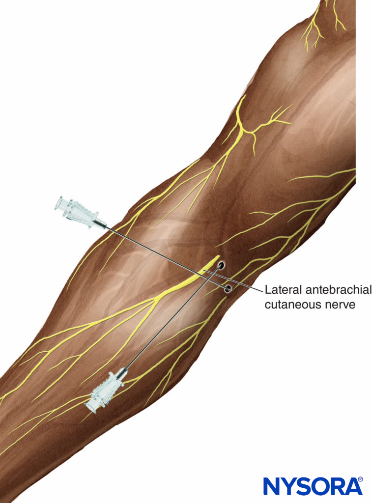 Techniques for anesthetizing the LAC and MAC nerves involveonly superficial injection of local anesthetic; thus the risk of nerve injury is very low. For this reason, these blocks may be preferable to selective elbow or wrist blocks as a supplement to incomplete brachial plexus anesthesia involving volar forearm cutaneous distribution.