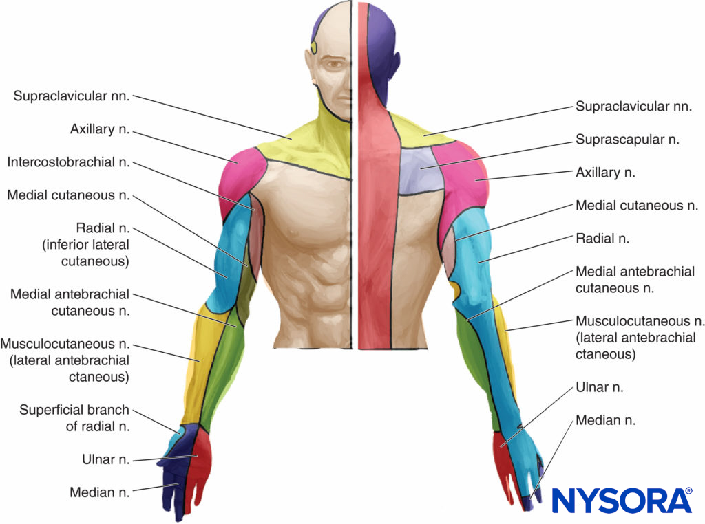 FIGURE 1. Cutaneous innervation of the upper extremity. Actual patients demonstrate large variation in the depicted pattern of innervation and significant crossover between nerves.