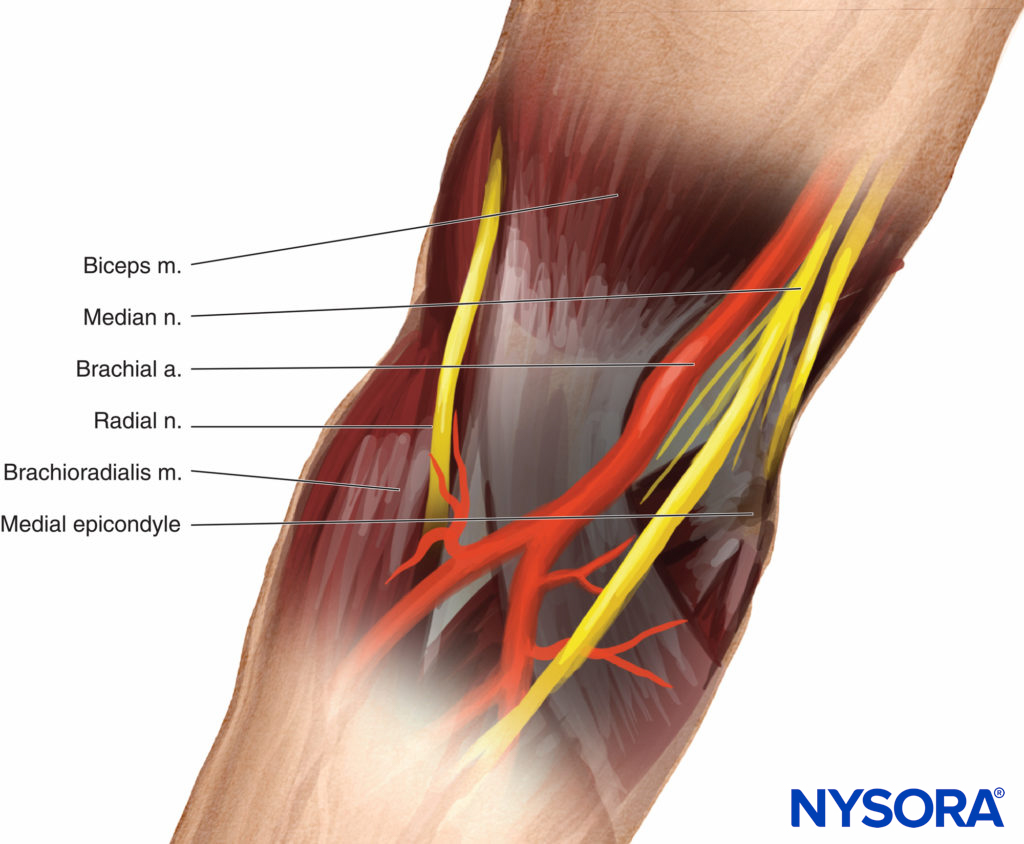 FIGURE 8. Radial and median nerves are approached at the level of the epicondyles. The radial nerve is found approximately 1.5 cm lateral to the biceps tendon. The median nerve is more superficial and identified by a needle placed just medial to the brachial artery.