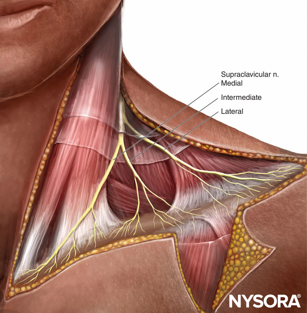 The supraclavicular nerve is derived from the ventral rami of the third and fourth cervical nerve roots (C3–C4); it is thus separate from the brachial plexus. The nerve becomes superficial as it penetrates the mid belly of the sternocleidomastoid muscle, thereafter forming three branches (Figure 3). These branches provide sensory innervation to the cape area, which spans from the midline to the deltoids, and from the second rib anteriorly to the top of the scapula posteriorly.