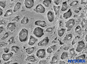 FIGURE 8. Endoneurium envelops myelinated axons in fascicles in a peripheral nerve. Scanning electron microscopy. Magnification ×3300. (Reproduced with permission from Reina MA, Arriazu R, Collier CB, et al: Electron microscopy of human peripheral nerves of clinical relevance to the practice of nerve blocks. A structural and ultrastructural review based on original experimental and laboratory data. Rev Esp Anestesiol Reanim. 2013 Dec;60(10):552-562.)
