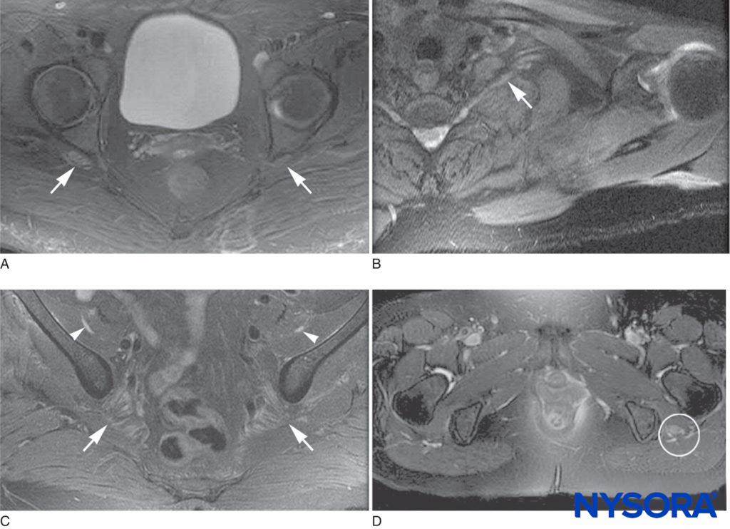 PSIN may even develop diffusely at multiple sites. Affected nerves show evidence of edema, microvascular derangements, myelin injury and loss, and axonal injury, with influx of acute inflammatory cells. Biopsy is required for definitive diagnosis of PSIN; however, magnetic resonance imaging is supportive of the diagnosis and, together with clinical evidence, may allow for presumptive diagnosis and therapy (Figures 2 and 3). Treatment with corticosteroids is helpful in many cases, and while most episodes of PSIN improve gradually over time, permanent sequelae have been reported. In 2011, Staff et al. summarized the most extensive database of cases of PSIN to date. A variety of different surgical types were involved, including orthopedic procedures, general surgery, and even dental cases. None of the 33 patients had received peripheral nerve block. The typical presentation was pain and weakness in the territory of the affected nerves; sensory changes were common as well. Twenty-one of the cases were confirmed by biopsy.