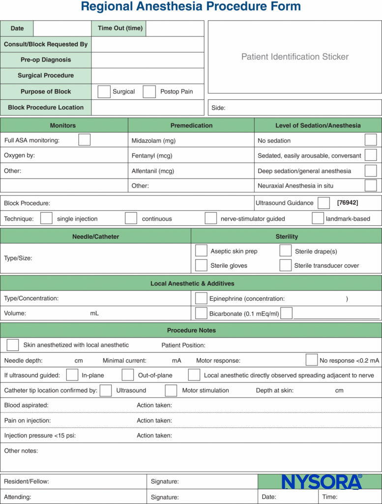 Another useful aspect of peripheral nerve block documentation is the recording of an ultrasound image or video clip, to be stored either as a hard copy in the patient’s chart or as a digital copy in the electronic health record (EHR) or separate secure hard drive. This not only is good practice from a medicolegal point of view but also is a required step that must be taken if the clinician wishes to bill for the use of ultrasound guidance. Any hard copies should have a patient identification sticker attached, the date recorded, and any pertinent findings high-lighted with a marker, such as local anesthetic spreading around nerve. Additional examples of highly practical documentation of essential nerve block and spinal anesthesia procedures are shown in Figures 9 and 10, respectively.