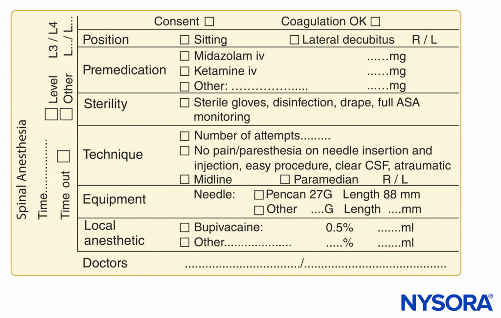 FIGURE 10. Essential elements of documentation of spinal anesthesia procedures used at NYSORA-Europe CREER (Center for Research, Education, and Enhanced Recovery From Orthopedic Surgery) at ZOL (Ziekenhuis Oost-Limburg), Genk, Belgium.