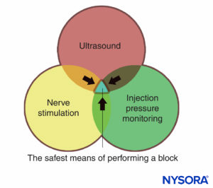 FIGURE 1. Three modes of monitoring peripheral nerve blocks for patient injury. The overlapping area of all three (blue area) represents the safest means of performing a block.
