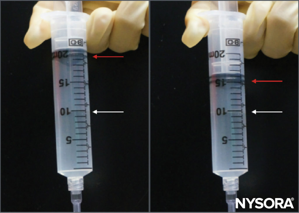 FIGURE 3. The compressed air injection technique. A 10-mL bubble of air is placed in the syringe of local anesthetic, which is then inverted. Compression of that bubble in a closed system to half of its original volume (ie, 5 mL) will increase the pressure in the system by 1 atm (14.7 psi).