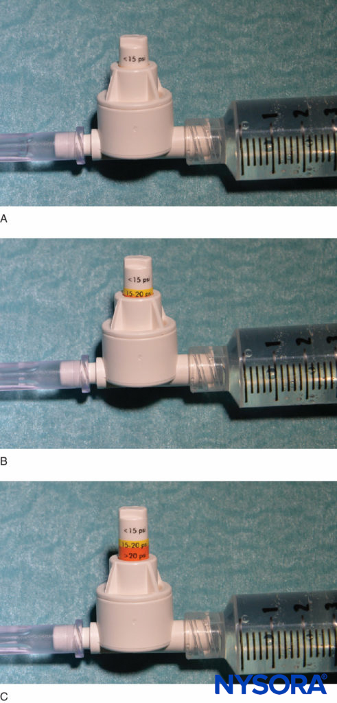 FIGURE 4. An example of a commercially available in-line pressure manometer (B-Smart, B. Braun Medical, Bethlehem, PA). As seen in A–C, respectively, the monitor displays pressure ranges in color on the movable piston: 0–15 psi (white), 15–20 psi (yellow), and more than 20 psi (orange). In clinical use, the exact opening injection pressure (OIP) is less important than prevention of exceeding the range of OIP associated with fascicular injury (>15 psi). Practically, this is avoided by aborting the injection with the appearance of any color on the piston throughout the injection cycle (>15 psi). Importantly, opening pressure (pressure at which the flow begins) is independent of the size of the syringe, tubing, and needle or injection speed (Pascal’s law).