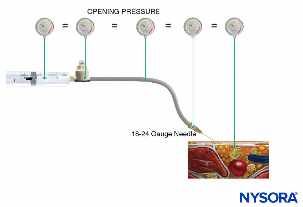 These data suggest that when the pressure in the system approaches 15 psi without the ability to commence flow of injectate, this high opening injection pressure may signal a dangerous needle-nerve relationship or needle placement in wrong tissue plane. Therefore, the injection should be halted and needle position reevaluated.