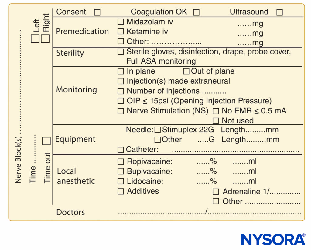 FIGURE 9. Essential elements of documentation of peripheral nerve block procedures used at NYSORA-Europe CREER (Center for Research, Education, and Enhanced Recovery From Orthopedic Surgery) at ZOL (Ziekenhuis Oost-Limburg), Genk, Belgium.
