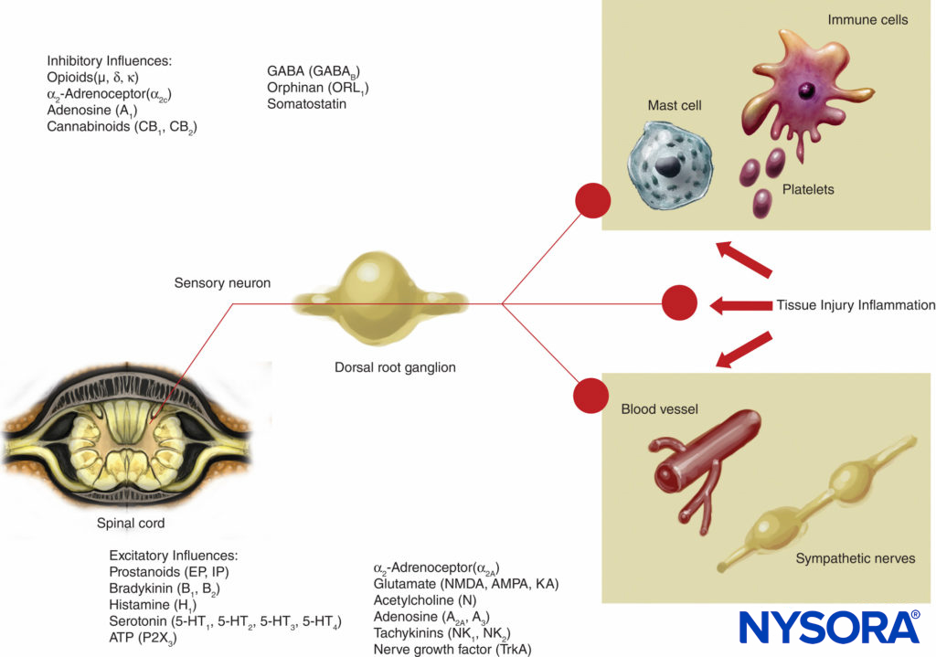 FIGURE 3. Excitatory and inhibitory influences on peripheral nerve activity by mediators released by tissue injury and inflammation and by a variety of agents acting on neuroreceptors. AMPA = α-amino-3-hydroxy-5-methylisoxazole-4-propionic acid; KA = kainic acid; NMDA = N-methyl-d-aspartate; NK = neurokinin; TrkA = Tropomyosin receptor kinase A.