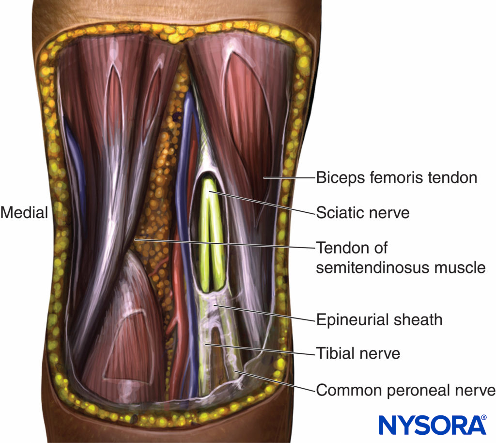 The tibial nerve is enveloped by a well-defined paraneural sheath; consequently, a single injection of a large volume of local anesthetic into the sheath of the tibial nerve may carry a higher success rate than an injection into the sheath of the common peroneal nerve. Note that in contrast to the common assumption, the sciatic nerve is not enveloped by the same tissue sheath as are the popliteal vessels; consequently, the concept of the neurovascular sheath is not applicable to this block. Instead, in the popliteal fossa, the sciatic nerve components are lateral and superficial to the popliteal artery and vein. This anatomic characteristic is important in understanding why vascular punctures and systemic toxicity are so rare after popliteal block.