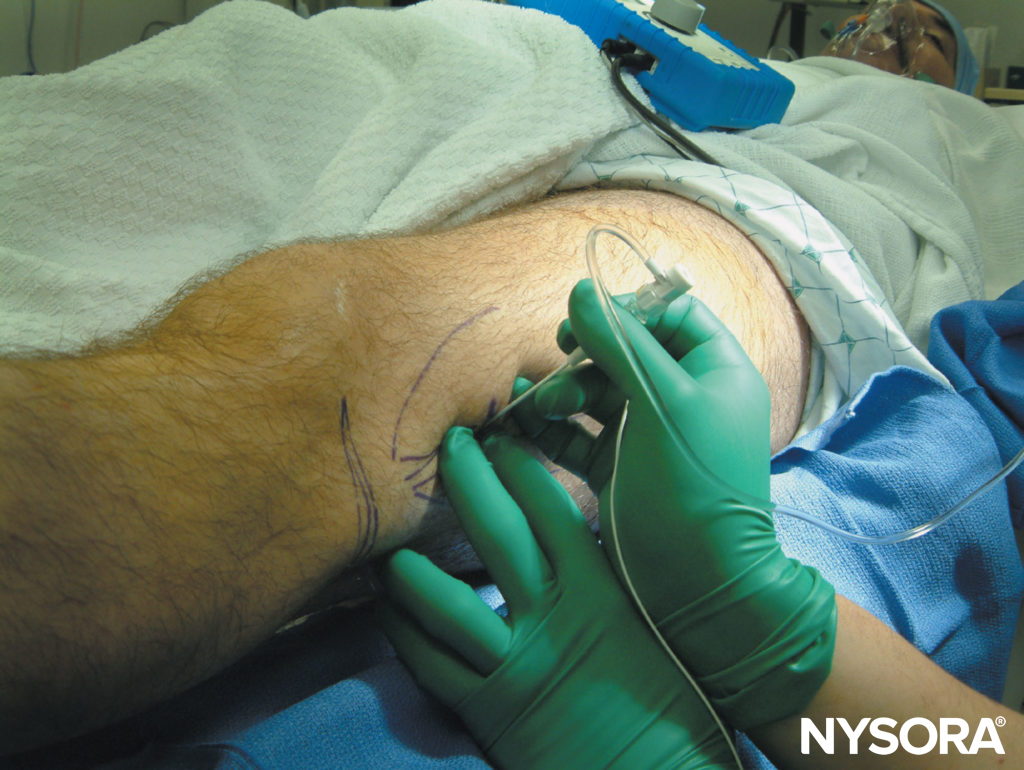 FIGURE 12. Popliteal block, lateral approach. Continuous technique is similar to the single-injection method except that a larger needle is used. The needle opening should be directed cephalad, and a slight cephalad needle angulation is used after localization of the sciatic nerve; these maneuvers facilitate insertion of the catheter.