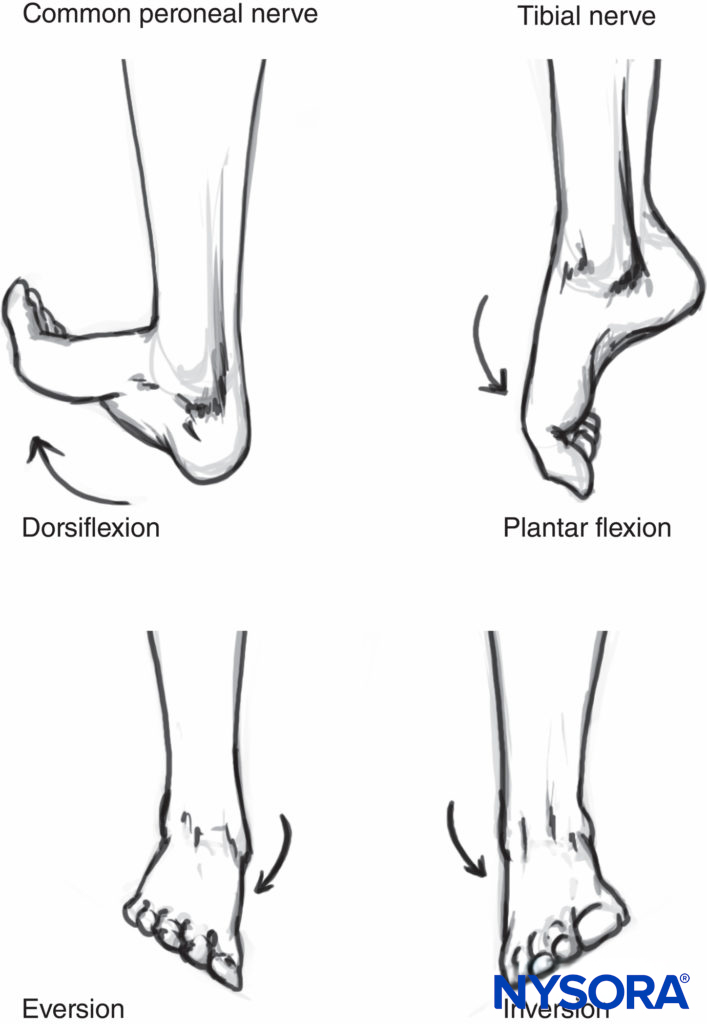 There are two types of motor responses that can be elicited with sciatic nerve stimulation at the level of the popliteal fossa. Common peroneal nerve stimulation results in dorsiflexion and eversion of the foot, whereas stimulation of the tibial nerve results in plantar flexion and inversion (Figure 7). As the stimulating current is being decreased, the twitch of the great toe often remains the only motor response seen with currents of <0.5 mA. Either response is adequate when the response is still present with current intensity of 0.2–0.4 mA (0.1 msec) as long as a large volume of local anesthetic is used. Some common responses to nerve stimulation and the course of action to obtain the proper response are shown in Table 2.