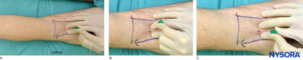 FIGURE 6. A. Popliteal block, intertendinous approach. The needle is inserted perpendicularly between tendons of the biceps femoris and semitendinosus muscles. B. In case no foot or toe twitch can be elicited, withdraw and redirect 15 degrees laterally. C. In case no foot or toe twitch can be elicited after redirection, withdraw needle completely, reinsert 1 cm laterally, and repeat the procedure starting with perpendicular needle insertion.