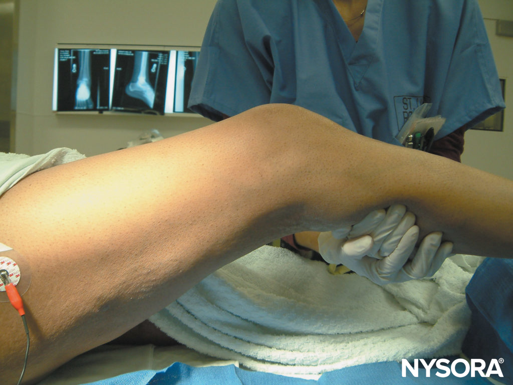 The patient is in the supine position. The foot on the side to be blocked should be positioned so that even the slightest movement of the foot or toes can be easily observed. This is best achieved by placing the foot on a footrest.