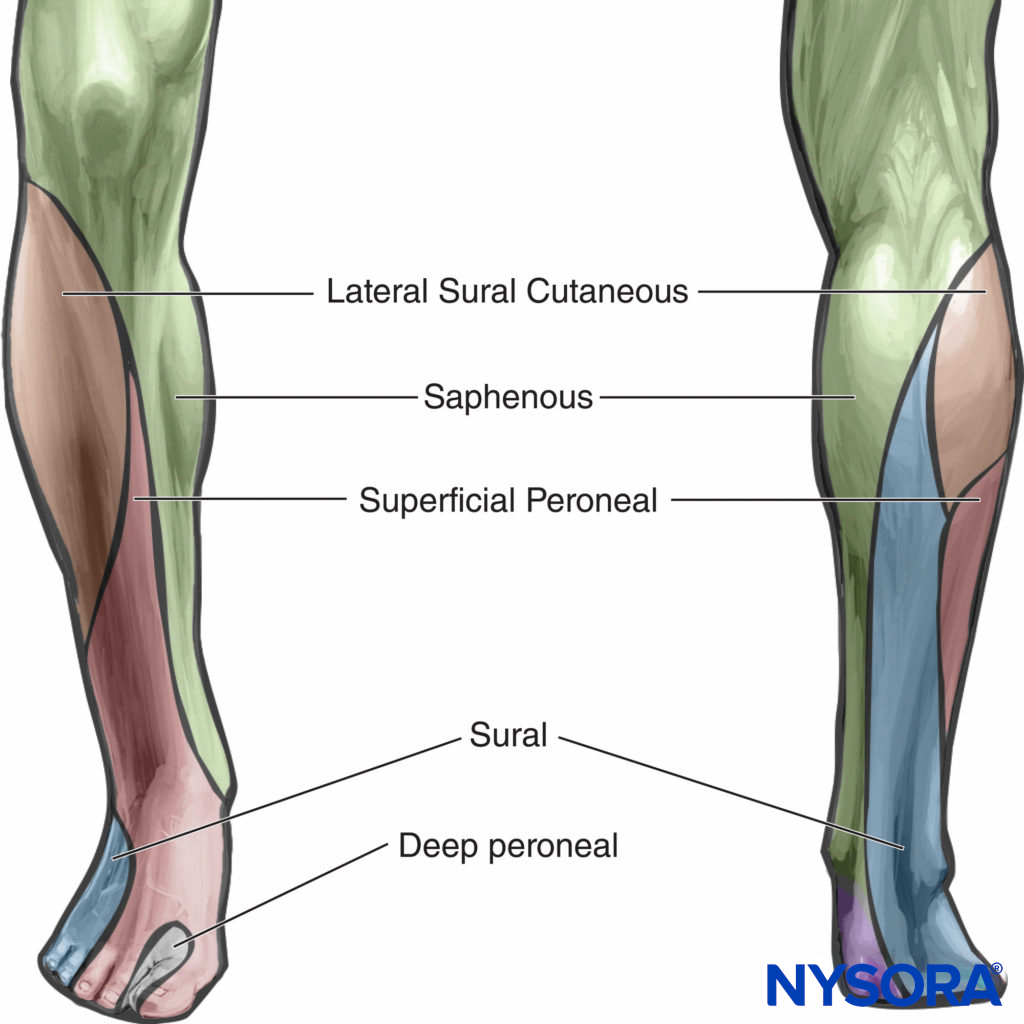 FIGURE 2. Sensory distribution of anesthesia after popliteal block. Popliteal block results in anesthesia of all shaded areas except that of the saphenous nerve (femoral).