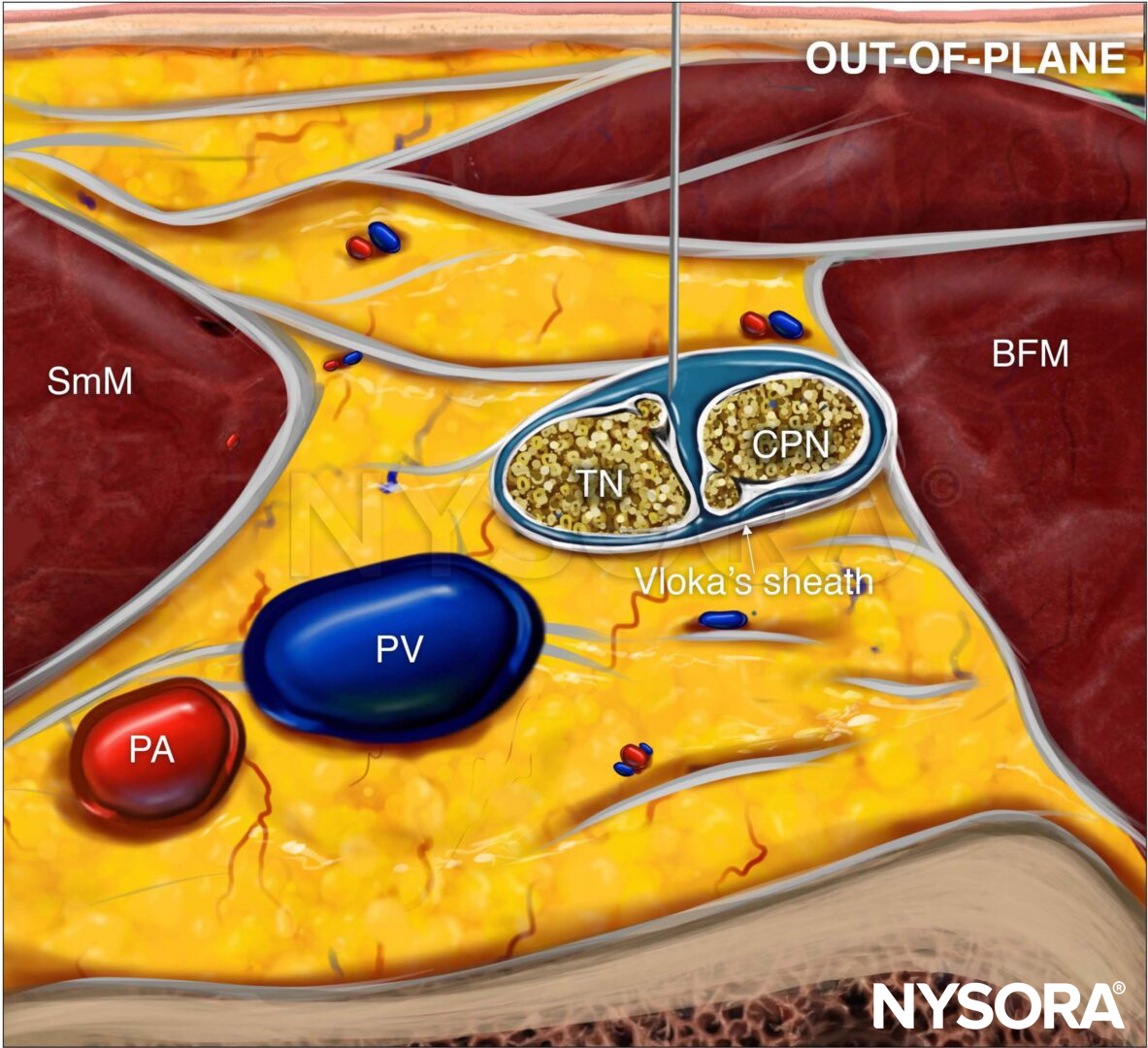 The goal is to inject the local anesthetic within the common connective tissue (Vloka’s) sheath that envelops the TN and CPN. Alternatively, separate nerve blocks of TN and CPN can be performed.