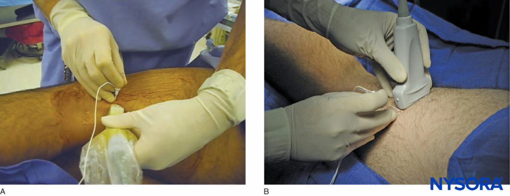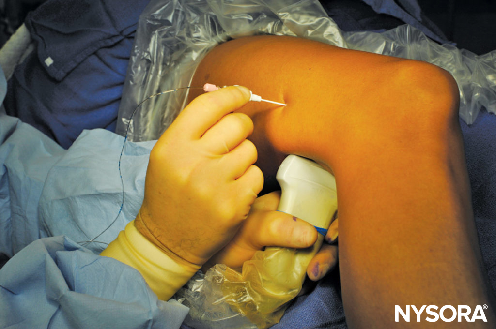 The lateral approach may have some advantage over the prone approach with regard to catheter placement. First, the biceps femoris muscle tends to stabilize the catheter and decrease the chance of dislodgement, compared with the subcutaneous tissue of the popliteal fossa in the prone approach. Second, if the knee is to be flexed and extended, the side of the thigh is less mobile than the back of the knee. Finally, access to the catheter site is more convenient with the lateral approach compared with the prone approach. A common starting infusion regimen is ropivacaine 0.2% at 5 mL/h with a patient-administered bolus of 5 mL every 60 minutes.
