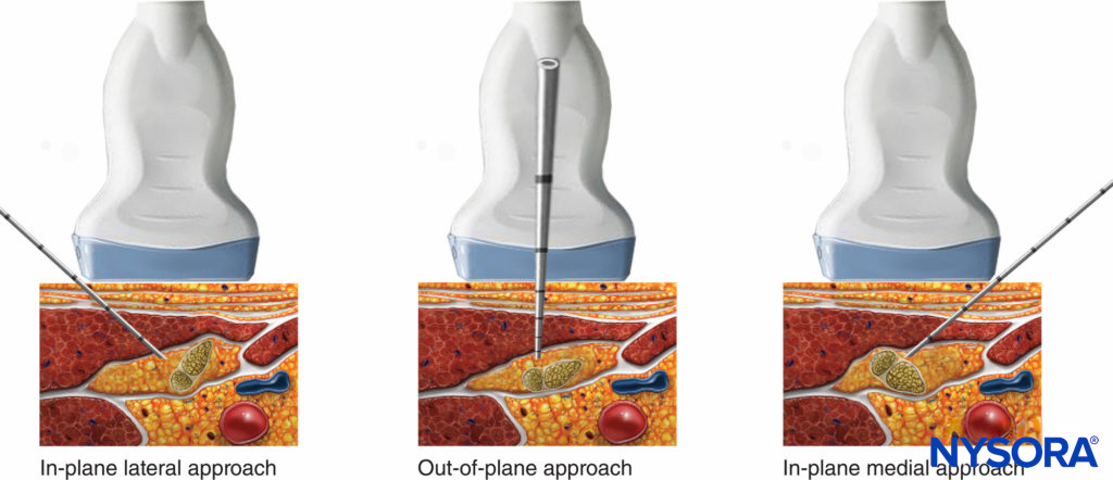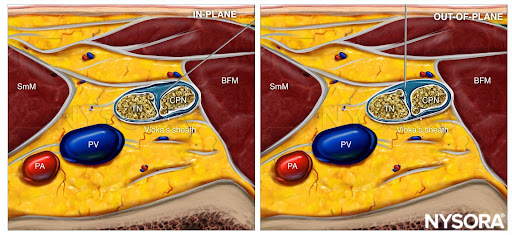 - In the posterior approach to the popliteal nerve block, either an in-plane (lateral or medial) or out-of-plane technique can be used (Figures 9 through 12). While the in-plane lateral approach is commonly used, the advantage of the out-of-plane approach is that the needle path is through the skin and adipose tissue rather than the muscles and thus, less painful.