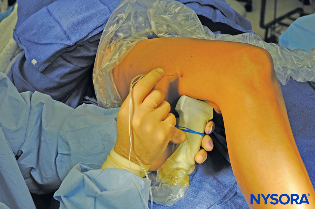 This nerve block is performed with the patient in the prone or lateral position (Figure 2). A small footrest is useful to facilitate identification of a motor response if nerve stimulation is used. A footrest also relaxes the hamstring tendons, making transducer placement and manipulation easier.