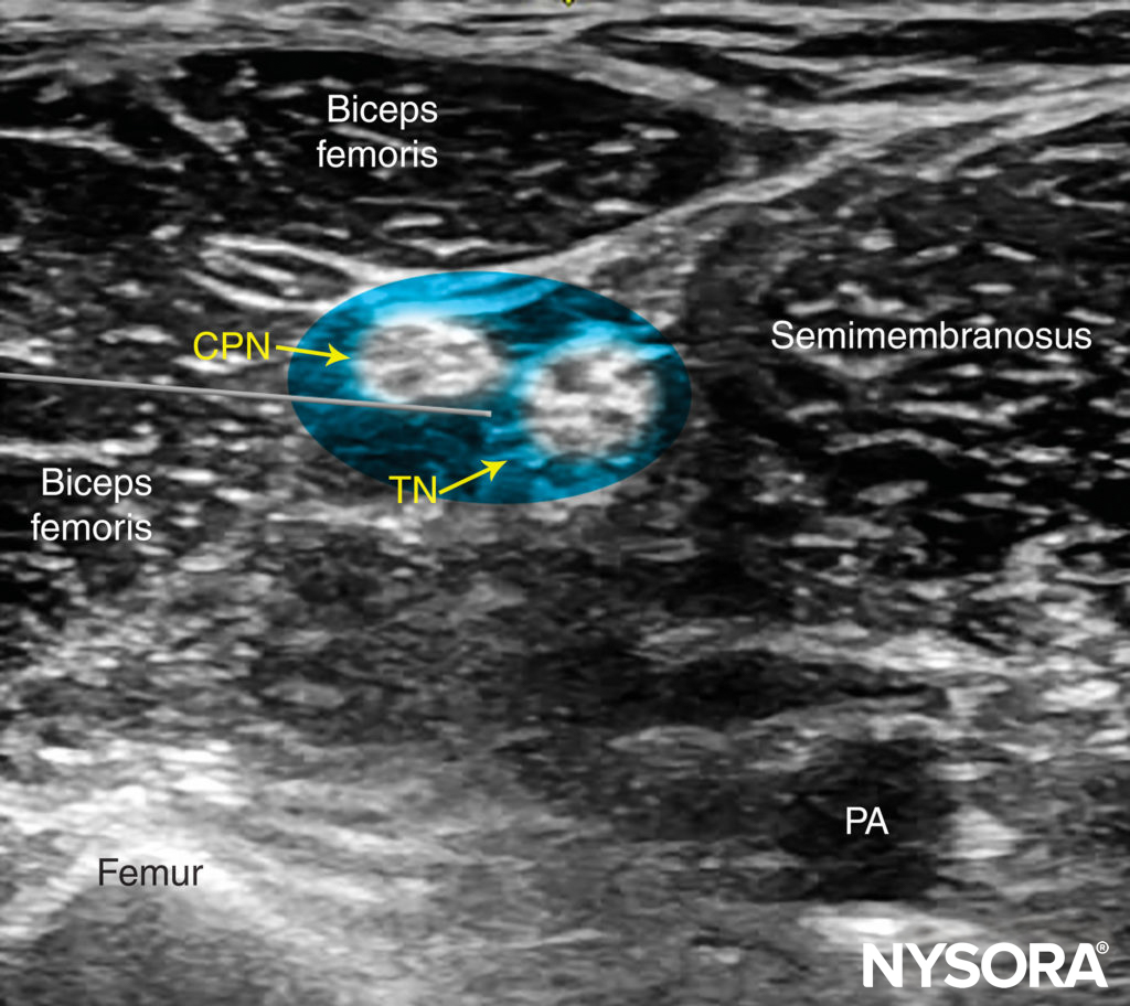 From the Regional Anesthesia Manual: Reverse Ultrasound Anatomy for a popliteal sciatic nerve block with needle insertion in-plane and out-of-plane and local anesthetic spread (blue). TN, tibial nerve; CPN, common peroneal nerve; PV, popliteal vein; PA, popliteal artery; SmM, semimembranosus muscle; BFM, biceps femoris muscle.