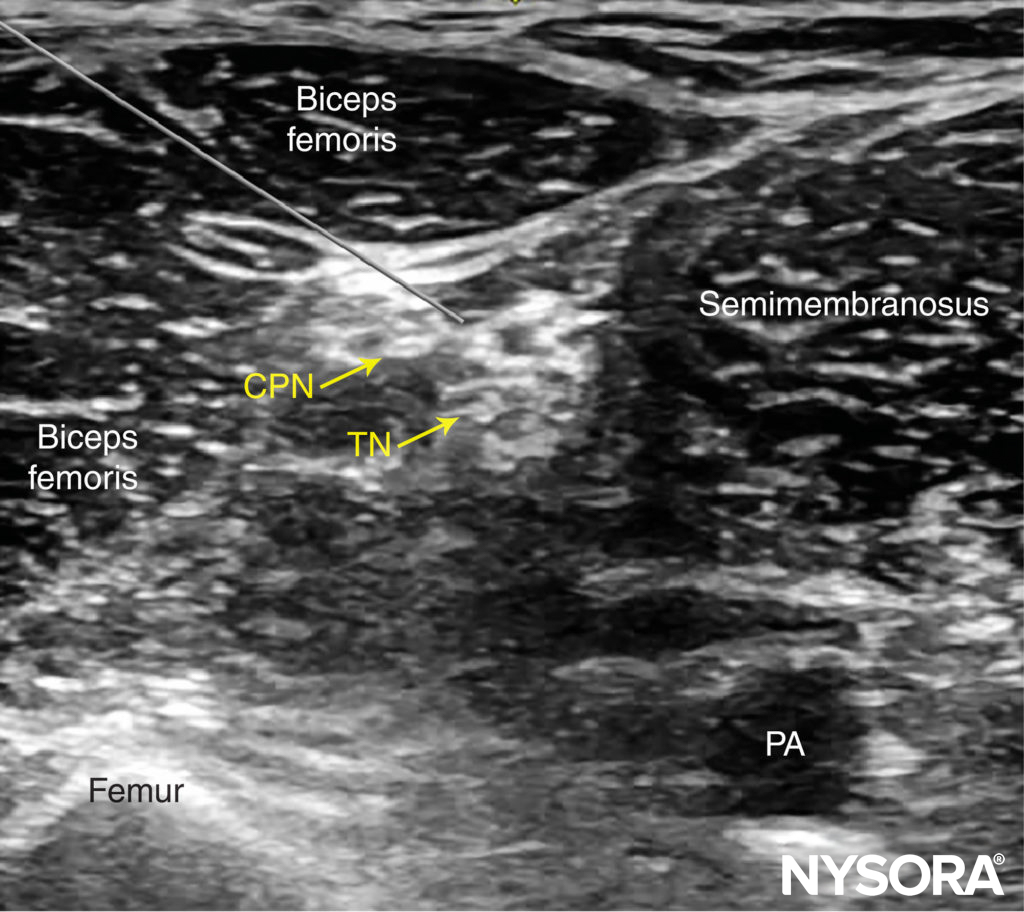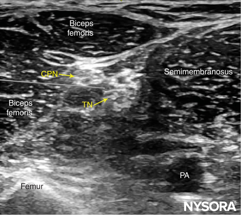 FIGURE 7. Simulated needle path and needle tip placement to nerve block the sciatic nerve (TN and CPN) using the lateral approach. PA, popliteal artery.
