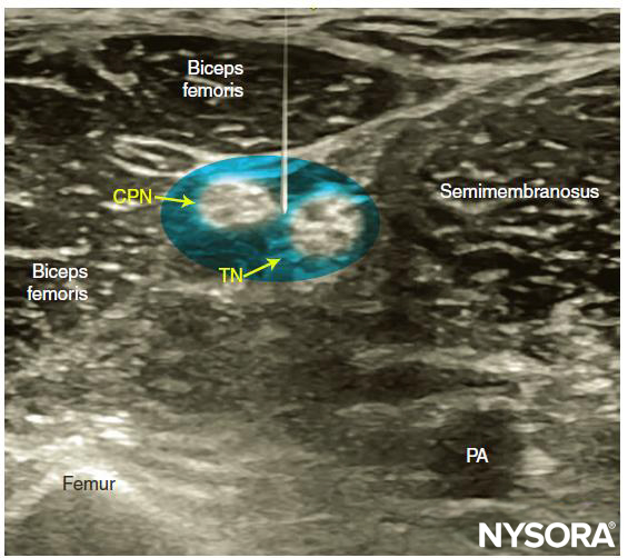 FIGURE 8. Simulated needle path and local anesthetic distribution to nerve block the sciatic nerve (TN and CPN) in the popliteal fossa using the lateral approach. PA, popliteal artery.