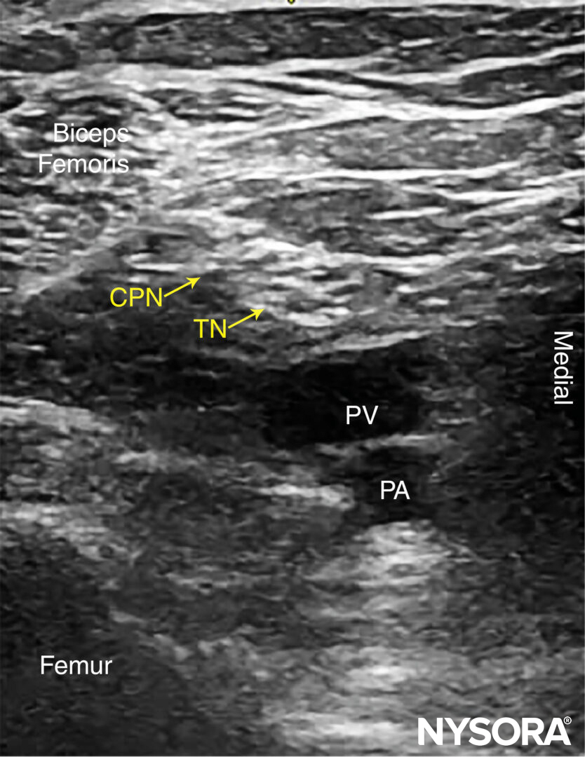 FIGURE 3. Sonoanatomy of the sciatic nerve at the popliteal fossa. The two main divisions of the sciatic nerve, the tibial nerve (TN) and the common peroneal nerve (CPN), are seen immediately lateral and superficial to the popliteal vein (PV) and artery (PA). This image was taken at 5 cm above the popliteal fossa crease, where the TN and CPN have just started diverging.