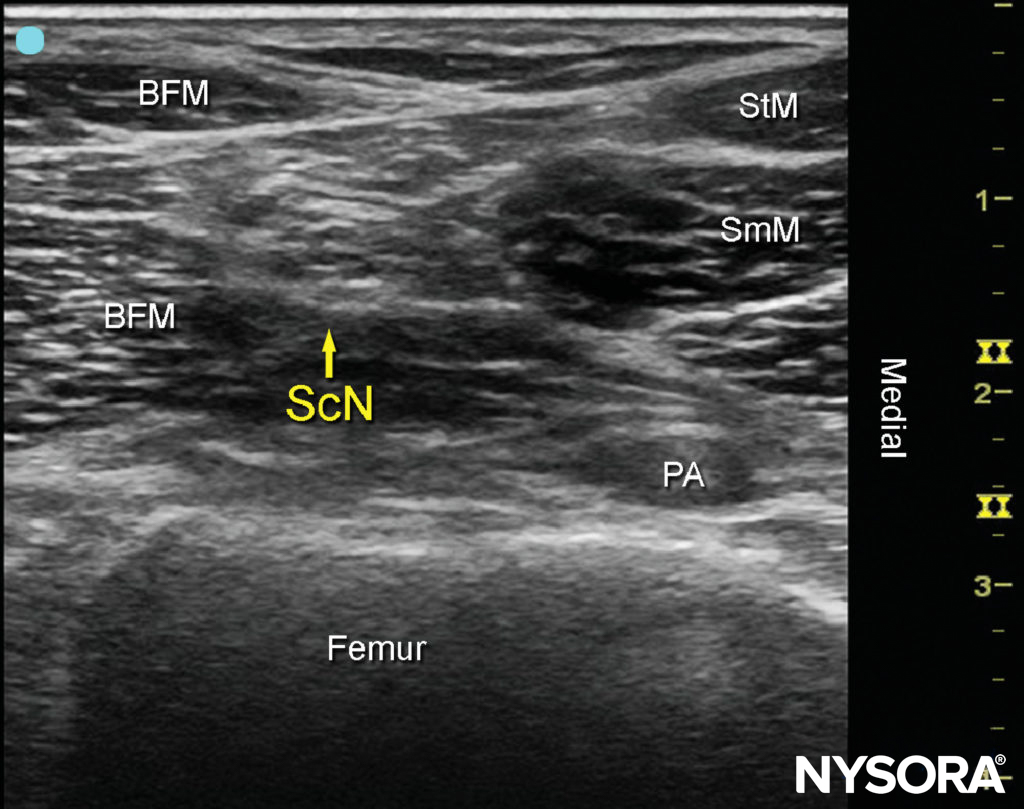 FIGURE 4 Sonoanatomy of the sciatic nerve (ScN) before its division. Shown are the ScN, superior and lateral to the popliteal artery (PA), positioned between the biceps femoris muscle (BFM) the semimembranosus muscle (SmM), and the semitendinosus muscle (StM).