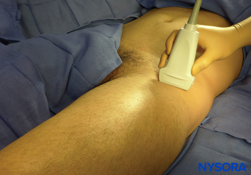 - Transducer position: Transverse, inferior to the anterior superior iliac spine; the lateral edge of the sartorius muscle should be visualized with ultrasound