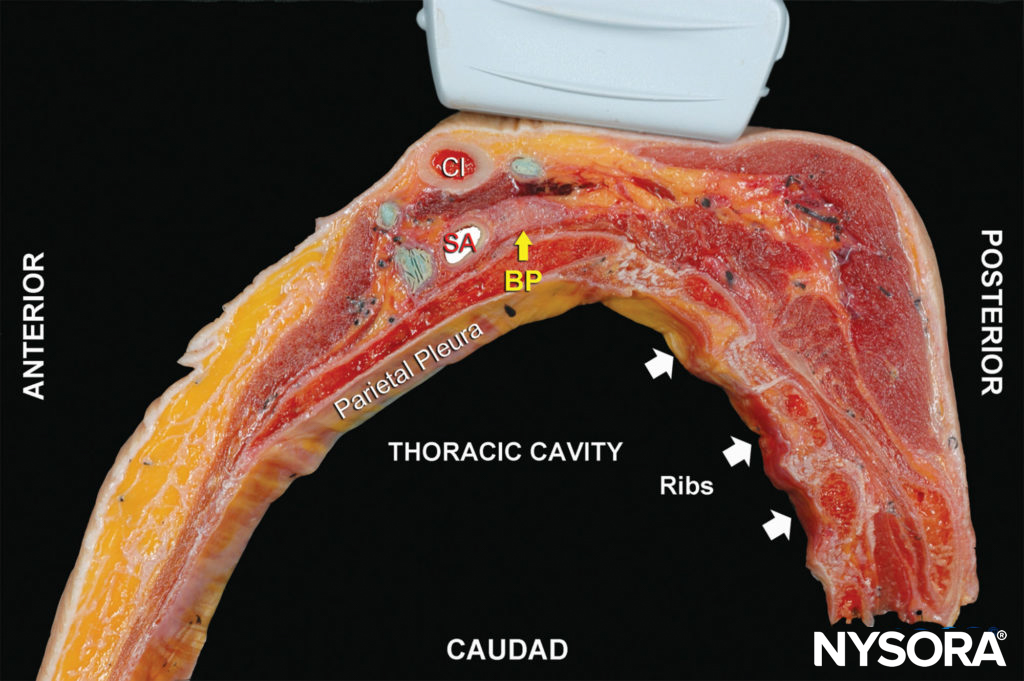 At this location, the proximity of the brachial plexus to the chest cavity and pleura had been of concern (Figure 2) until ultrasound (US) guidance renewed interest in the supraclavicular approach to the brachial plexus nerve block. The ability to image the plexus, rib, pleura, and subclavian artery with US has increased safety due to improved monitoring of anatomy and needle placement. Because the trunks and divisions of the brachial plexus are relatively close as they pass over the first rib, the extension and quality of anesthesia are favorable. For these reasons, the supraclavicular nerve block has become a commonly used technique for surgery of the upper limb distal to the shoulder.