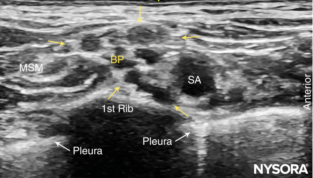 FIGURE 3. Supraclavicular brachial plexus (BP; yellow arrows) seen slightly superficial and posterolateral to the subclavian artery (SA). The brachial plexus is enveloped by a connective tissue sheath. Note the intimate location of the pleura and lung to the brachial plexus and subclavian artery. MSM, middle scalene muscle.