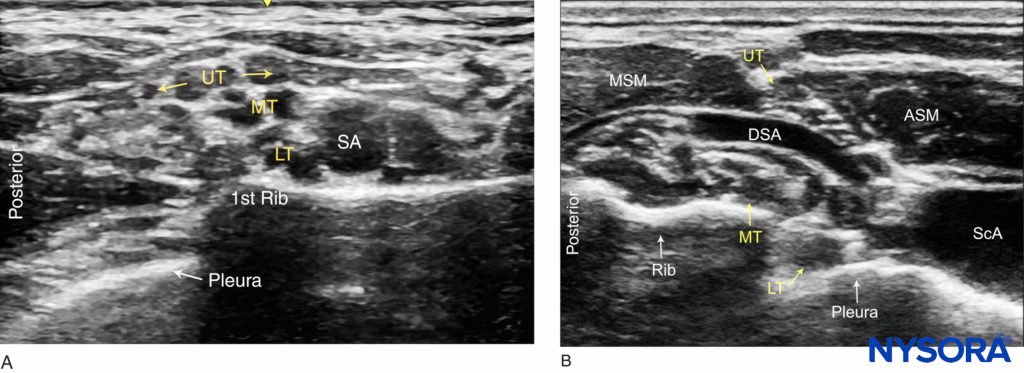 FIGURE 4. Ultrasound images of the brachial plexus cephalad to the clavicle. (A) Sagittal view: The upper (UT), Middle (MT) and lower (LT) trunks of the brachial plexus are seen posterior to the subclavian artery (SA) and superficial to the first rib. (B) Oblique view: The upper trunk (UT) is positioned between the anterior (ASM) and middle (MSM) scalene muscles. The lower trunk (LT) and the subclavian artery are superficial to the pleura.