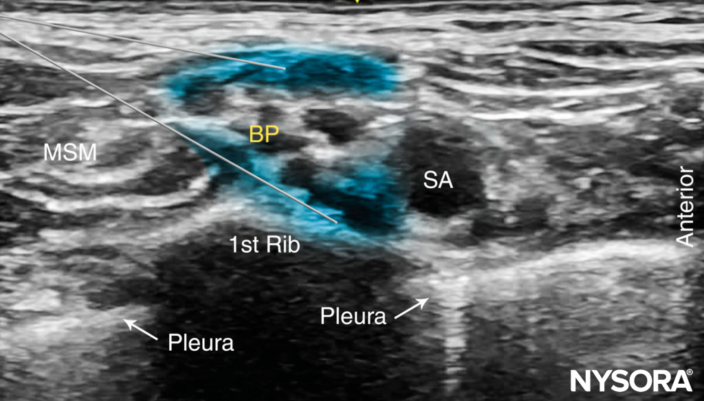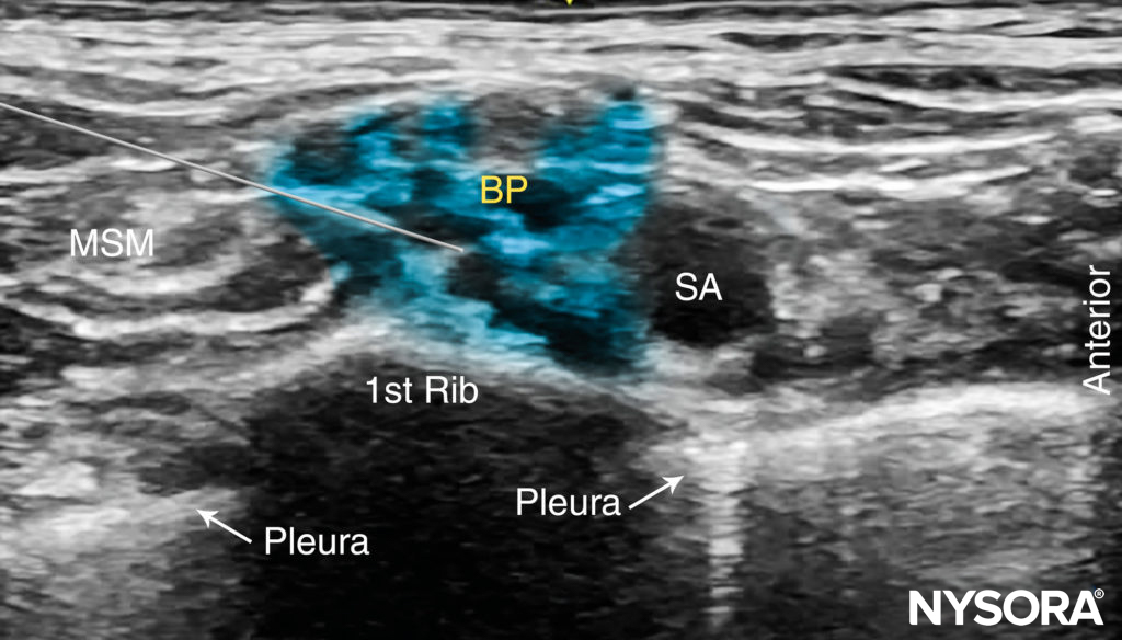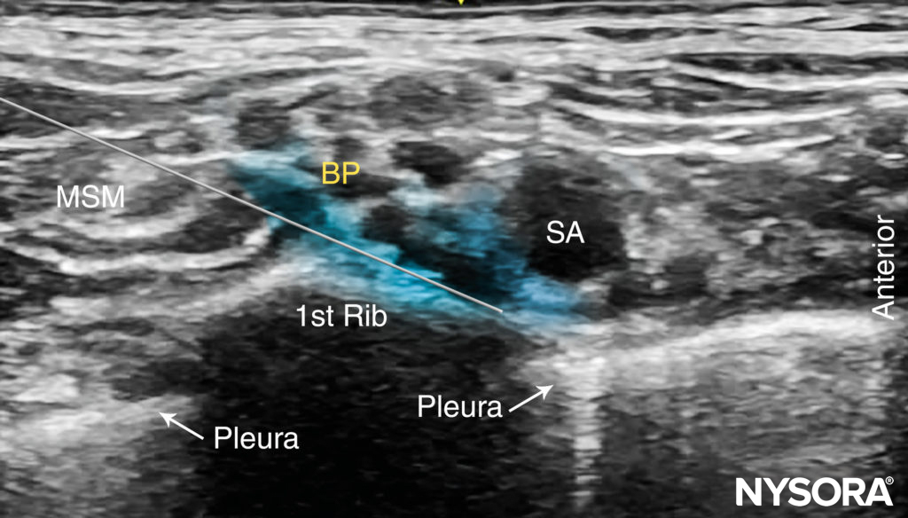 From the Regional Anesthesia Manual: Reverse Ultrasound Anatomy for a supraclavicular brachial plexus block with needle insertion in-plane and local anesthetic spread (blue). SCM, sternocleidomastoid muscle; ASM, anterior scalene muscle; SA, subclavian artery; MSM, middle scalene muscle.