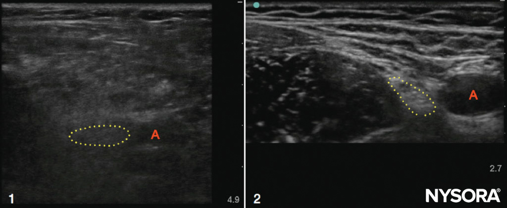 FIGURE 2. Ultrasound scans of the femoral regions in an obese (1) patient and a slim (2) patient. Note the increased depth required to image the artery (A) and nerve (dotted outline) in the obese example, as well as the overall poor resolution quality due to the excess adipose tissue. In contrast, the nerve, artery, muscles, and fascial planes in the slim patient are crisp and well defined.