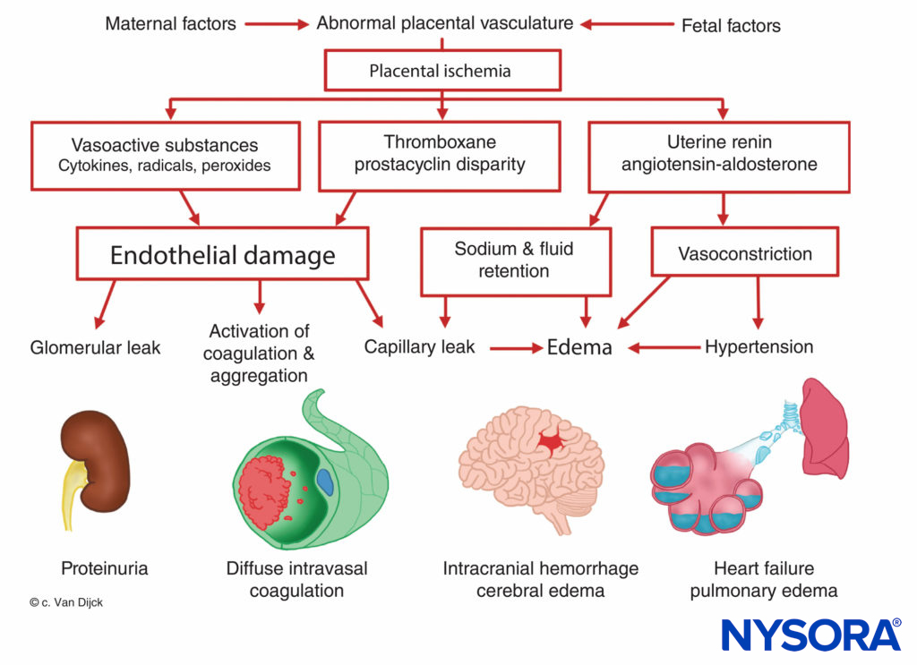 According to the latest theory, endothelial cell injury is central to the development of preeclampsia. This injury occurs as a result of reduced placental perfusion, leading to a production and release of substances (possibly lipid peroxidases) causing endothelial cell injury. Abnormal endothelial cell function contributes to an increase in peripheral resistance and other abnormalities noted in preeclampsia through a release of fibronectin, endothelin, and other substances.