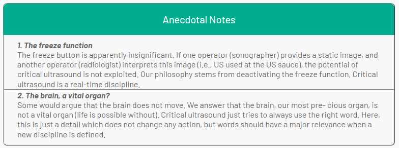 We quite never touch the countless preand post-processing possibilities nor all modern facil- ities, mainly harmonics. Annotations are useless when the examination is not made by a radiologist (or technician) for a doctor: the spirit of critical ultrasound.