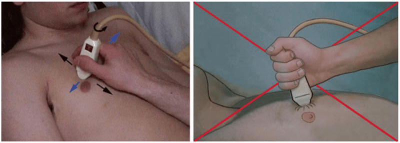 Some beginners hold the probe too tight. This probe must be withdrawn without effort from the operator’s hand by another person. One secret is the suppleness of the hand. Often, the young user is discouraged since he got a suboptimal image, whereas the experienced user comes nonchalantly after and obtains a much nicer image. Yet the difference is often due to minimal changes. Whereas the probe keeps its mark on the young user’s hand (like, almost always, the joystick of a first flight – a sign of intense crispation), the experienced user holds it slightly and is not afraid to move it liberally. The Carmen maneuver (see just below) is to our knowledge the best way to dramatically improve an image.