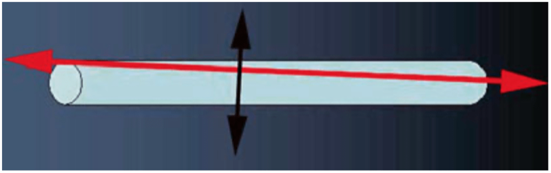 Fig. 2 Long vs. short axis. Cross-sectional vs. axial scan. This figure shows these two incidences for approaching a tubular structure – with a slight drift. Whereas the cross-sectional scan (black, 3°) is roughly insensitive to this drift, the axial scan (red, just 2°) is much more affected. Slight movements can make the vein disappear out of plane, at worst simulating a positive compression maneuver, and all in all make ultrasound a more difficult discipline. Cross-sectional scans are easy like guitar (long axis difficult like violin): the vein is always promptly visible on the screen (one is free to prefer violin anyway)