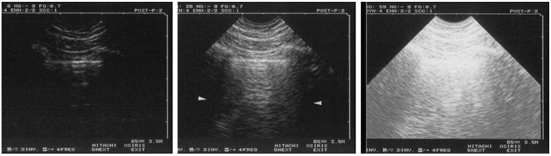 Fig. 3 Standardized gain for lung ultrasound. Longitudinal scan of the lung. Left: The gain is too low. Details are lost. Middle: The gain is optimal, clearly showing the pleural line. Right: The gain is too high: superficial areas are saturated
